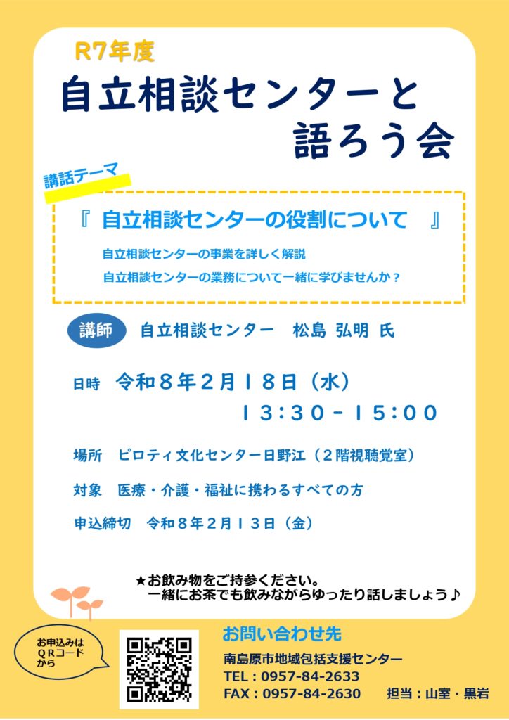 令和7年度第4回 自立相談センターと語ろう会 2026年01月19日 最終更新日時 : 2026年01月19日 南島原包括 R7年度 第4回目は自立相談センターと語ろう会を開催します 自立相談センターの松島様より、センターの役割などご説明いただいた後、意見交換会を行います。 多くのご参加お待ちしております。 申し込みはこちらから