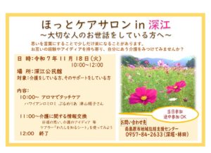 11月18日(火)10:00~ 深江公民館にて「ほっとケアサロン」(介護者のつどい)を開催いたします。 ほんの少しの時間ですが、ケアをしている方が、自分のための時間として過ごしていただけるよう内容をご準備しております。 […]